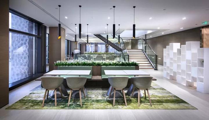 清透的玻璃和充滿生機(jī)的綠植墻打造的步行樓梯,以此鼓勵(lì)內(nèi)部人員的流動(dòng)。同時(shí)周邊開(kāi)放的設(shè)計(jì)意在創(chuàng)建一種基于動(dòng)態(tài)的工作模式(ABW),通過(guò)協(xié)作空間將人們聚集在一起。