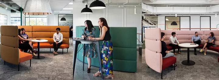 豐富多元的工作空間包括專注工作、團(tuán)隊(duì)協(xié)作和休閑等功能空間,每個(gè)空間都配置以不同程度的視覺和聽覺等隱私的設(shè)計(jì)考量。在以中性色為主調(diào)的空間中,加入優(yōu)雅靚麗的復(fù)合色(又叫“三次色”)來營(yíng)造活力的視覺效果。
