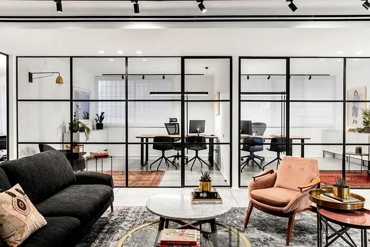 現代照明,復古地毯,棉布窗簾,用于墻壁裝飾的本地藝術攝影,植物,書籍和其他配件等,使該寫字樓裝修設計空間煥發出舒適的居家氛圍。