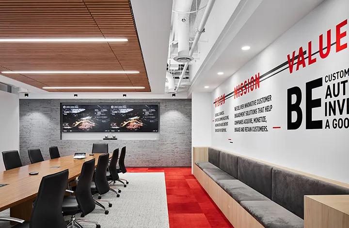 深圳裝飾公司的設(shè)計(jì)團(tuán)隊(duì)在簡單的走廊和繁忙的會議廳設(shè)計(jì)鼓舞人心的文字標(biāo)語和圖形設(shè)計(jì);裝飾在明亮,開放的頂表面上的吸音板來自徽標(biāo)的幾何結(jié)構(gòu)。紅色還用于裝飾開放式辦公室區(qū)域的門,家具和天花板。