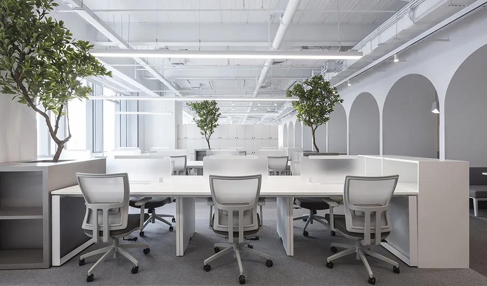 延續基調主題,工作區以白色為主,灰色為輔,以“干凈”“安靜”的空間孕育靈感。為了保證儲物需求,儲物柜巧妙地設置在地板分散的中間區域,深圳裝修公司以滿足員工的需求,豐富整個空間,保持布置整潔。這與白色的噴漆裸天花線條縱橫交錯,豐富了整個空間的層次感。