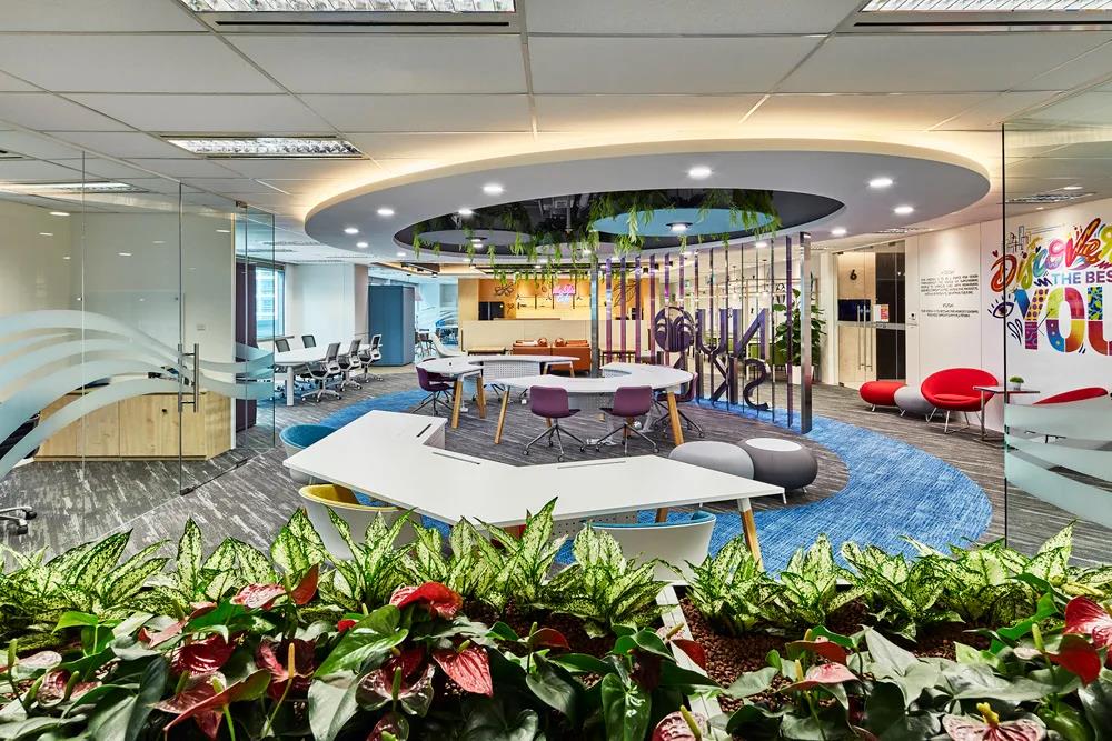 為兼顧開放布局中的活力與私密性需求,方案采用漸進式分區方式。深圳裝飾公司用不同質感的材料劃分活動社交區和重點工作區。辦公室的一端是充滿活力的如新咖啡廳,另一端是以白色為主的安靜空間,為需要專注于工作的員工提供了一個不受干擾的環境。方案充分考慮了后COVID-19時代的工作模式,辦公室裝修設計可以同時滿足現場工作和遠程工作的需求。靈活的空間整合非接觸式數字解決方案,讓如新東南亞保持領先姿態,迎接未來。