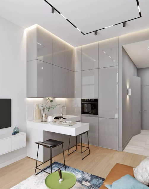 我們?cè)谛粜脱b修設(shè)計(jì)中因空間受限,時(shí)常難以妥善規(guī)劃,深圳裝飾公司雄宇裝飾便將公私領(lǐng)域一分為二,從玄關(guān)進(jìn)入即可看見一道墻隔開客餐廳與臥室。公空間雖然狹小,但運(yùn)用斑駁藍(lán)白地毯便能簡(jiǎn)單作出區(qū)隔,此時(shí)搭配對(duì)比色深橘沙發(fā),就可輕易塑造視覺主焦點(diǎn),穩(wěn)定室內(nèi)不顯紊亂;廚房柜體則透過延續(xù)玄關(guān)淺灰色調(diào),借此連貫空間營(yíng)造寬敞感,料理區(qū)則保留簡(jiǎn)易烹調(diào)器具,深圳家庭裝修并且以L型臺(tái)面連結(jié)吧臺(tái)桌面拓展出精簡(jiǎn)用餐區(qū)。