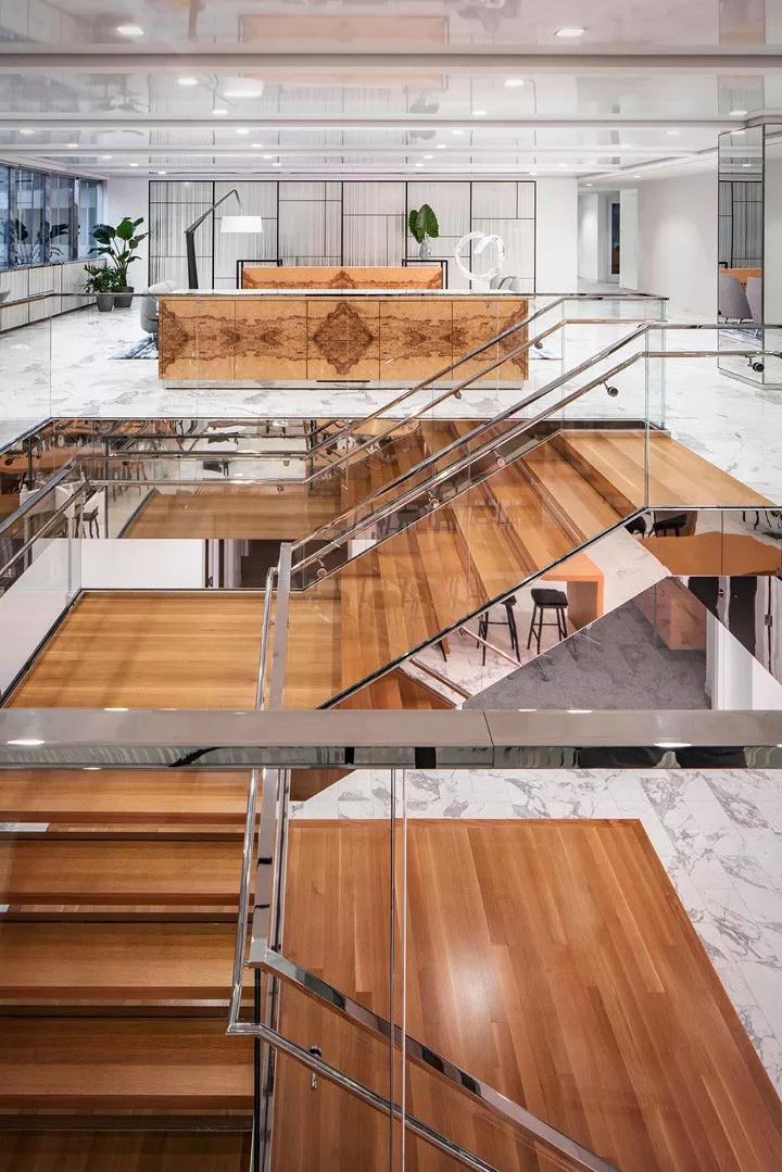 室內(nèi)裝修以通透的玻璃來(lái)制作隔墻,利于光和視線的穿透。黃褐色樹(shù)瘤橡木飾面板制作的接待前臺(tái)也是本案的一大看點(diǎn),均衡對(duì)稱的蝴蝶紋樣的木紋圖形帶來(lái)戲劇化的視覺(jué)效果,猶如一張代表公司形象的藝術(shù)名片,令人為之驚嘆。